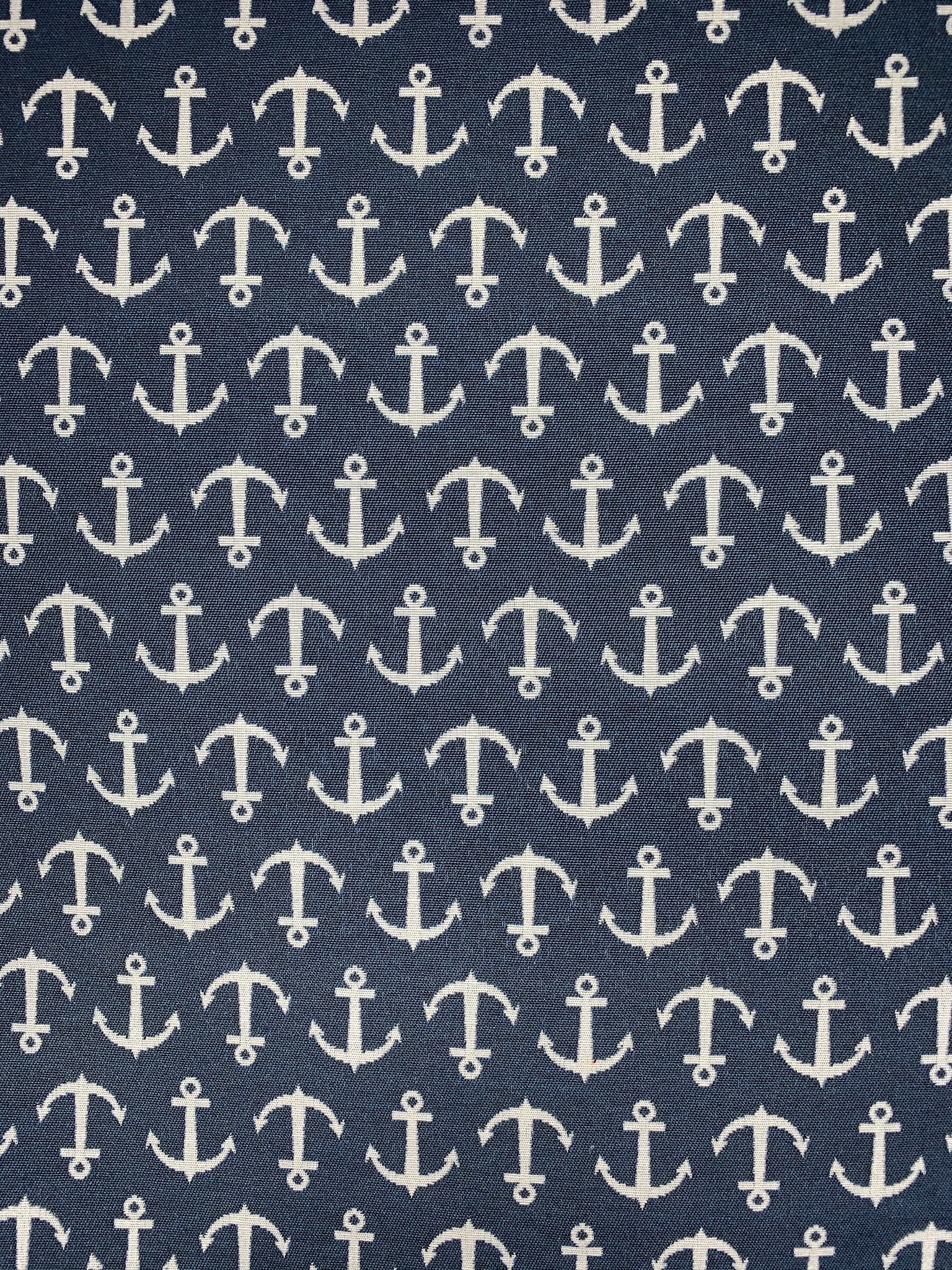 Dieser Stoff mit maritimem Ankerdesign ist besonders dick und stark. Der Gobelin-Stoff besteht aus Jacquard-gewebten weißen Ankern, die in Reihen nebeneinander, oben und unten angeordnet sind.