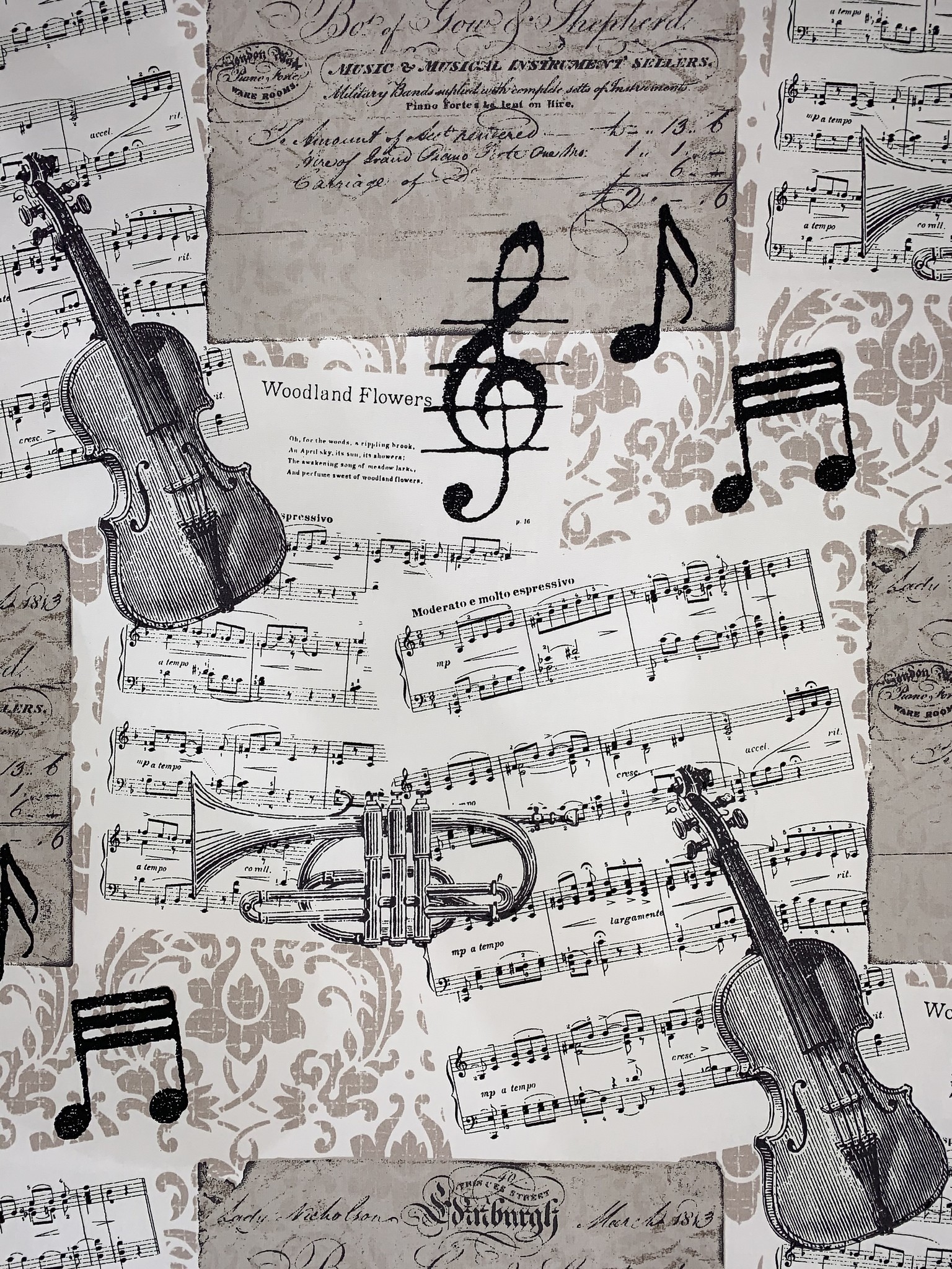 Prachtige katoenen decoratiestof met een muzikaal dessin. De brede stof heeft een schitterende print met o.a. muziekinstrumenten zoals de viool en trompet. Tussendoor vakken met de Franse lelie en handgeschreven teksten. over de hele stof staan muzieknoten en muzieksleutels.