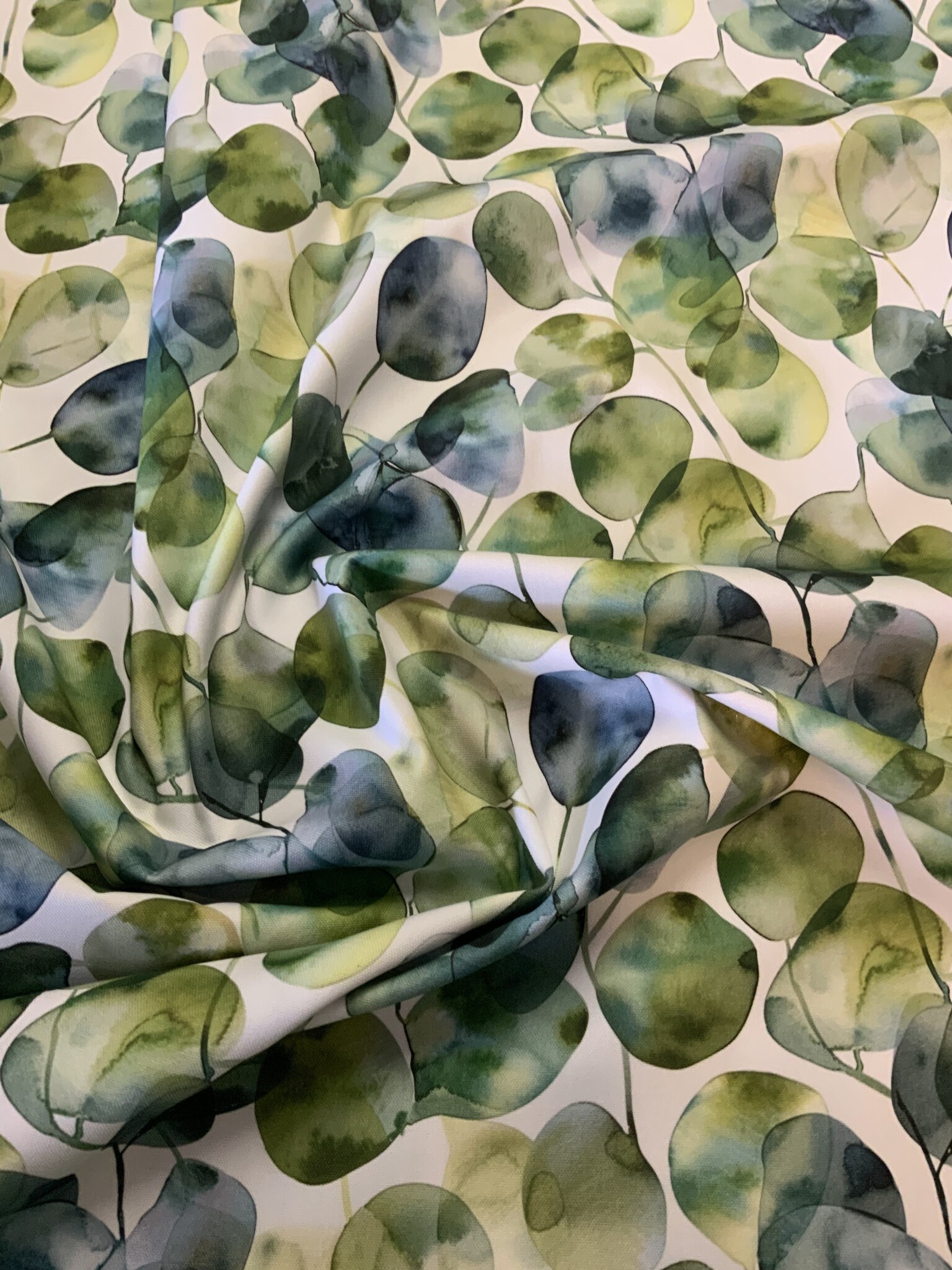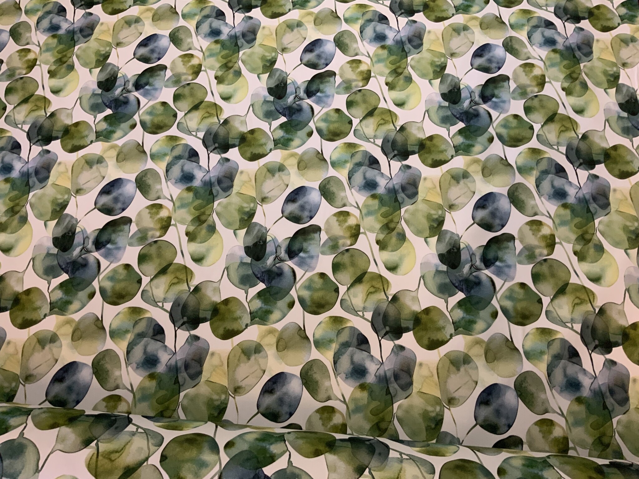 Al jarenlang is een design met Eucalyptus bladeren een garantie voor succes. Zo ook dit nieuwe design in zachte blauw groene tinten.